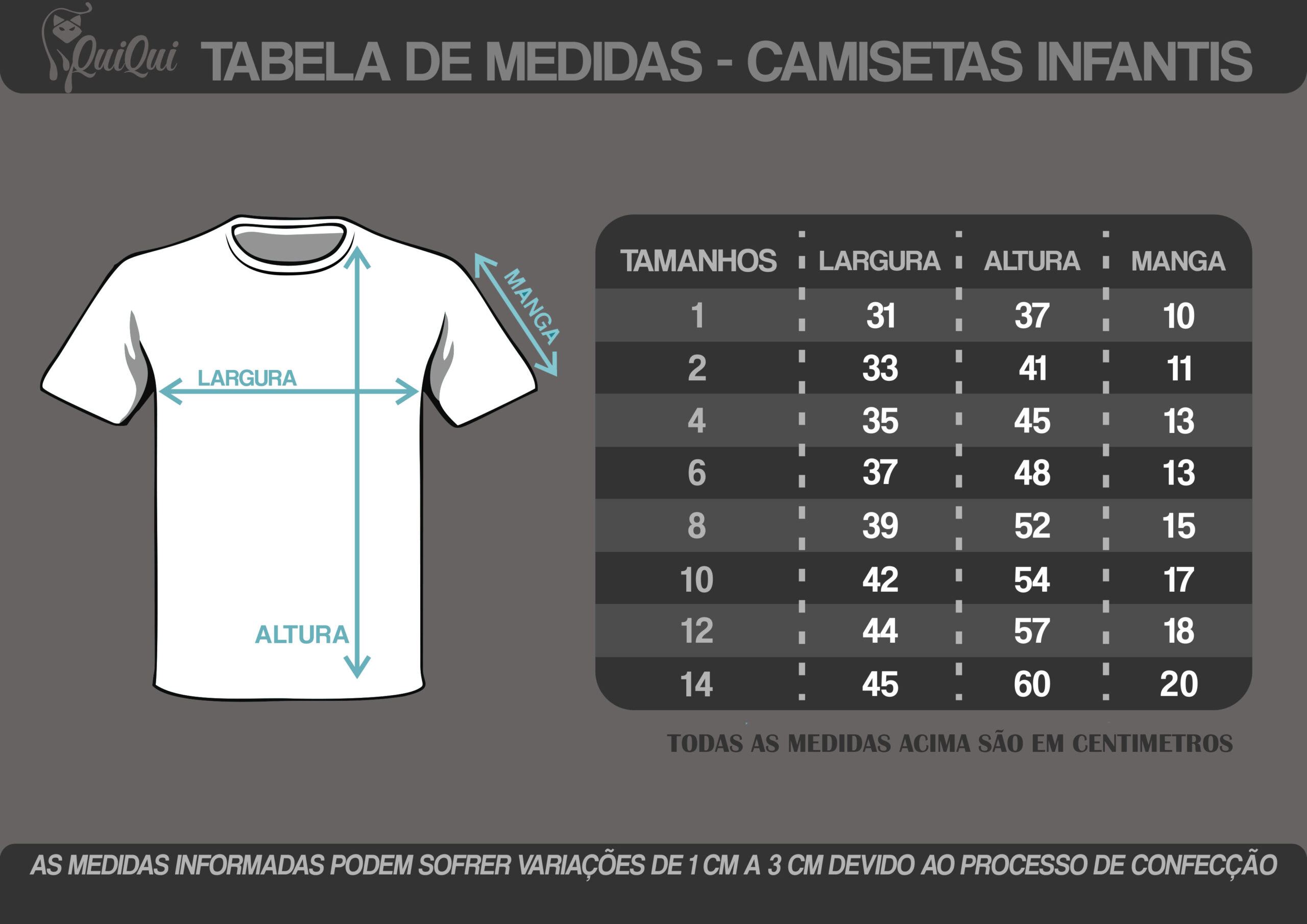 As medidas podem apresentar variação de 1 a 2 cm devido ao processo de confecção.